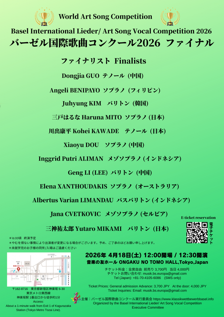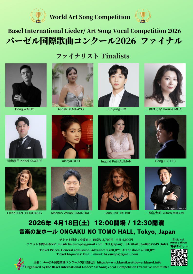 World Art Song CompetitionBasel International Lieder/Art Song Vocal Competition 2026 Final Round Saturday, April 18,2026 ONGAKU NO TOMO HALL, Tokyo,Japan General admission Advance: 3,700JPY At the Door :4,000JPY E -Ticket reservation ← click |