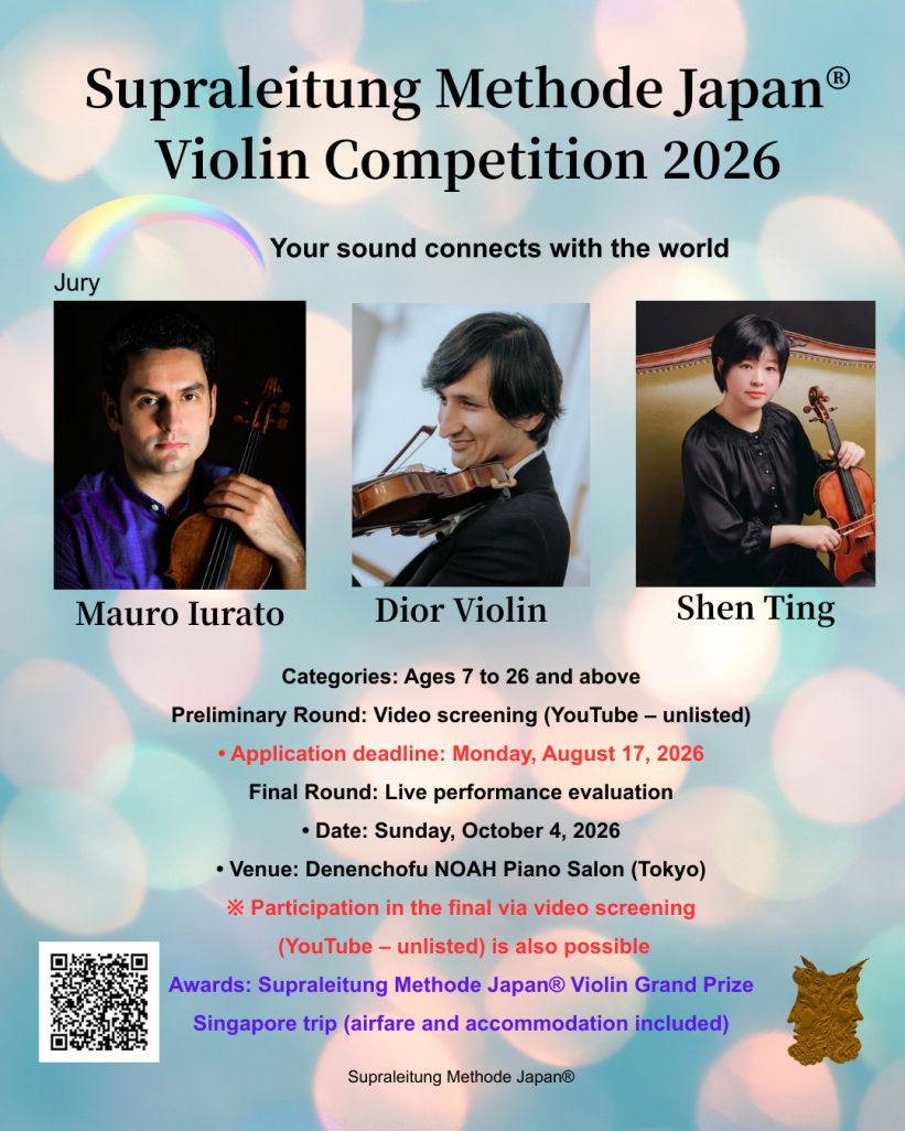 Supraleitung Methode Japan®︎ Violin Competition 2026Application Deadline: Monday, August 17, 2026 Apply ← click Preliminary Round Fee •All categories: 15,000 JPY by paypal ← click |